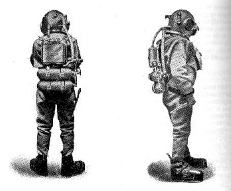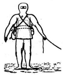 This equipment consists of the standard dress and helmet. One or two steel cylinders with a mixture of air and oxygen, a metal chamber containing CO2 absorbent, an air-chest weight containing two small bottles with a mixture of oxygen and air, connected to an air inlet valve on the helmet.