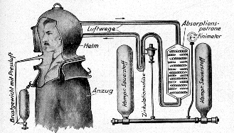 initiate his own ascend. This device could only be used up to 20 meters of depth ! The supply of pure oxygen would be dangerous is greater depths. In 20 meters of depths the maximum dive time was about 2 hours. This could be dangerous also when constantly breathing pure oxygen. However, there was of course a large amount of nitrogen in the suit so the inhaled gas was never exactly 100 % oxygen. |