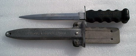 Research suggests the Royal Navy diver's knife of a similar design was in used since before 1914. Navy regulations stated all divers and attendants must carry a knife The knives were generally carried on a frog or small loop of leather which hung from the divers belt, however some of the more specialised groups of Navy divers carried the knives in their boot as the Charioteers would. The sheath was not stamped with the maker's name whereas the blade of the knife was stamped. A similar pattern of knife was the Non-magnetic knife used by clearance divers . Both the knife and the sheath was stamped Non- Magnetic.