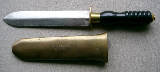 | Remarks: Last in series of the standard brass Heinke knives. A non serrated version was also available with both edges straight and sharp. |