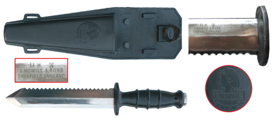 | Remarks: Photo courtesy: Knife history. This knife design was manufactured by Hopkinson's (see photo) under both the Hopkinson's name and the John Nowill name (see the next knife below). The knife is still made by Divex who also make a non-magnetic version with a beta-titanium blade. A non-magnetic version was also made by Nowill & Sons. The knife was first produced in the early 70s and is still current issue in the Royal Navy today. N-S numbers are as follows: on blade or hilt 4220-99-523-9744;sheath 4220-99-523-9745 and straps 4220 -99-523-9746.Some variations include 1) no markings on the knife or sheath .2) maker's name and NSN etched on blade with NSN in relief on sheath (before 1979) and 3) NSN is on rubber hilt instead of blade (1979 onwards). |
