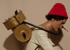 In 1865, with the help of Navy officer Auguste Denayrouze, the device was made suitable for diving. The diver carried a canister with compressed air on the back. A demand regulator working with a membrane was attached to it. The design featured some parts developed by Siebe. With a compressor air was brought to the container and from there to the mouth. The regulator was capable of leveling the air pressure in the lungs to the pressure of the surrounding water. A noseclip prevented water from coming in the nose. In this case you see a reproduction Aerophere. |