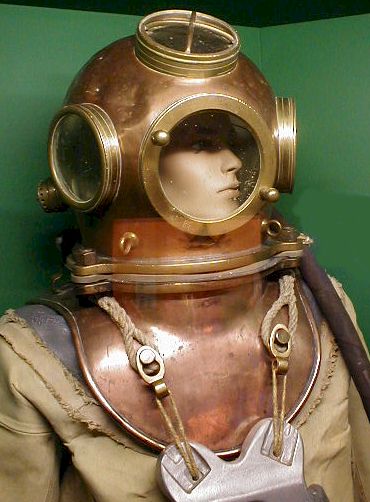 Many divers complained about the system. Especially because it was cold and dangerous without protective dress and helmet. In the same year, 1865, Denayrouze developed a copper and brass half helmet. It was attached to a protective dress and to the Aerophere. The helmet was referred to as "le Groin" or "the pig's snout" because it looked like a pig's face.